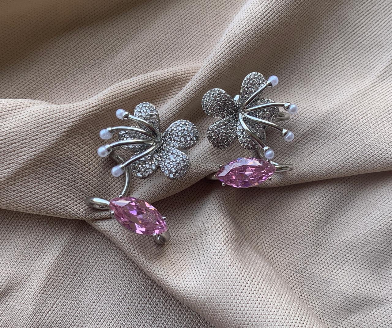 Elevate your style with these crystal pink stone earrings, designed in a striking dynamic form paired with a chic cuff. The shimmering crystals and soft pink stones add a graceful sparkle, while the cuff detail brings a modern edge — the perfect blend of elegance and bold sophistication.