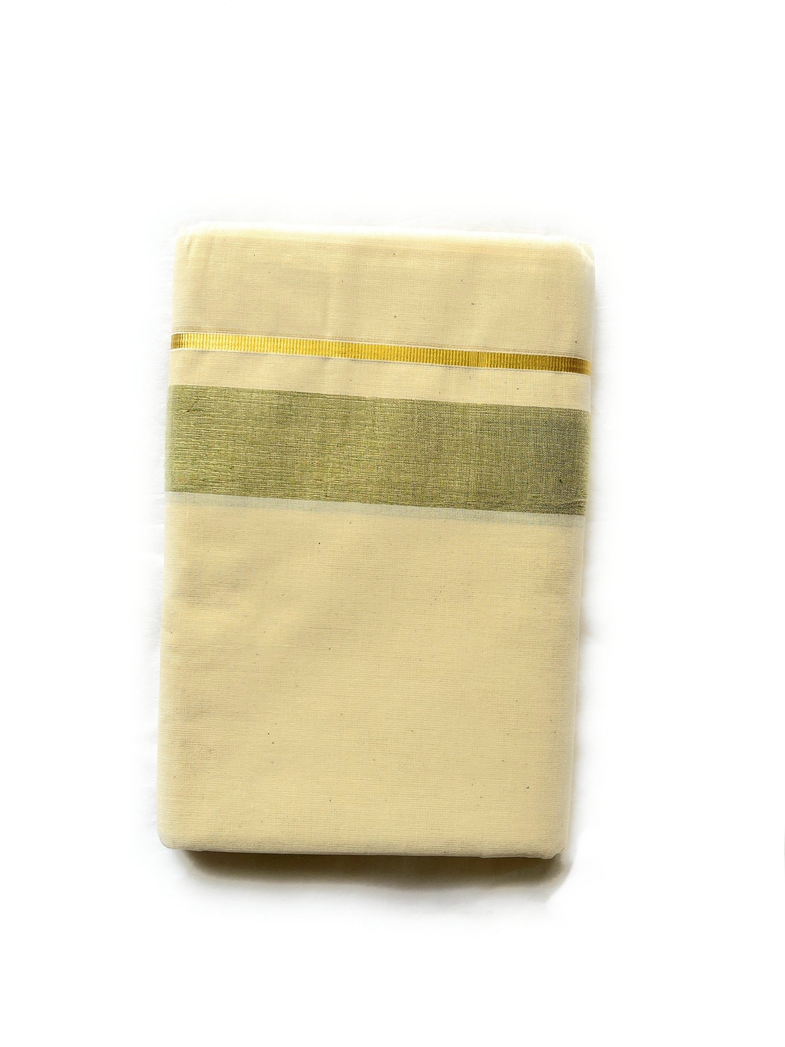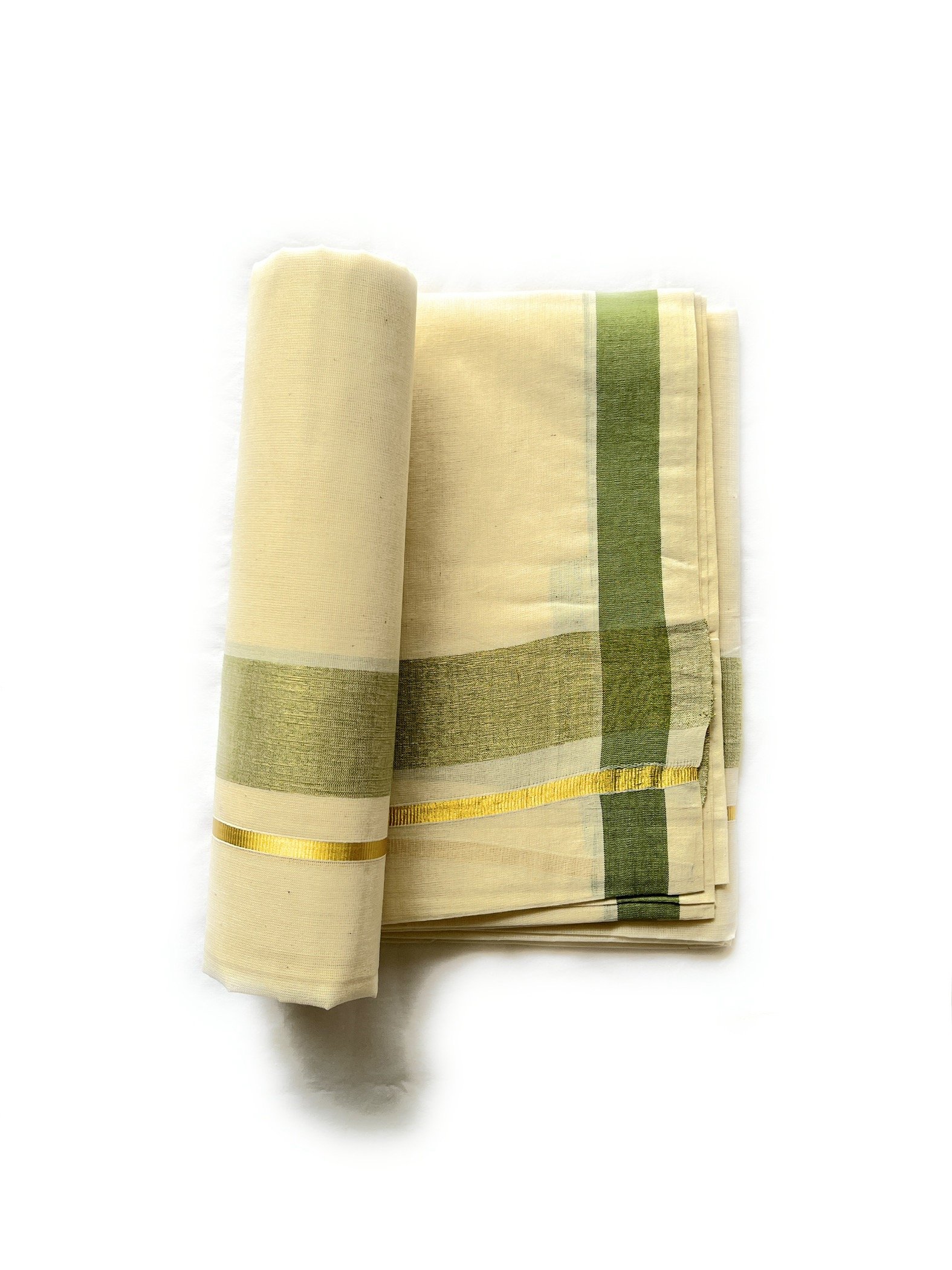 Kerala Traditional Handloom Dhoti with Kasavu Borders Woven with care by skilled artisans, this pure cotton handloom dhoti embodies the timeless grace of Kerala’s heritage. Adorned with lustrous Kasavu borders in shimmering gold, it reflects a blend of tradition and sophistication. Soft, breathable, and elegant, it’s perfect for festive occasions, weddings, and cultural celebrations — a symbol of purity and pride passed down through generations.