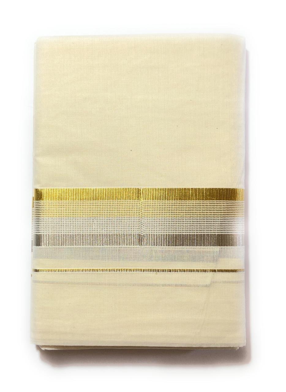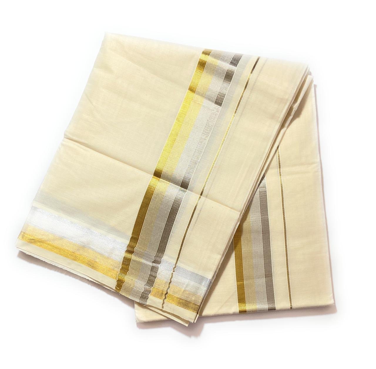 Kerala Traditional Handloom Dhoti with Kasavu Borders Woven with care by skilled artisans, this pure cotton handloom dhoti embodies the timeless grace of Kerala’s heritage. Adorned with lustrous Kasavu borders in shimmering gold, it reflects a blend of tradition and sophistication. Soft, breathable, and elegant, it’s perfect for festive occasions, weddings, and cultural celebrations — a symbol of purity and pride passed down through generations.