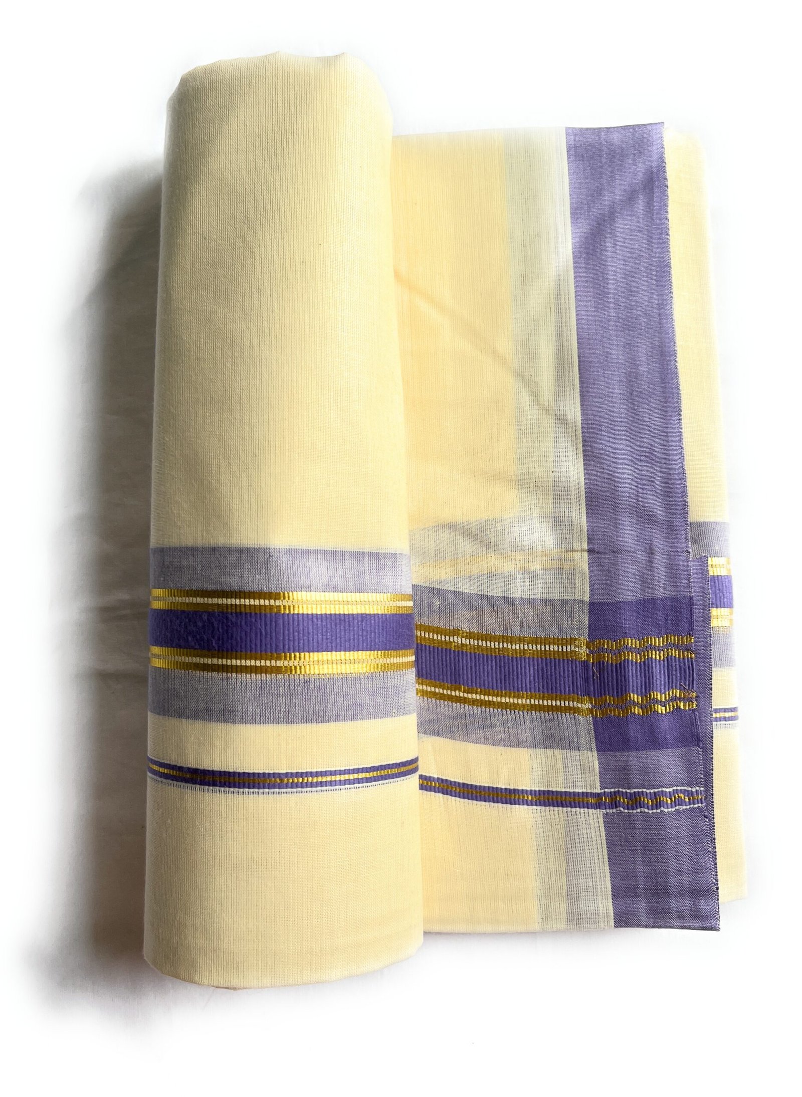 Kerala Traditional Handloom Dhoti with Kasavu Borders Woven with care by skilled artisans, this pure cotton handloom dhoti embodies the timeless grace of Kerala’s heritage. Adorned with lustrous Kasavu borders in shimmering gold, it reflects a blend of tradition and sophistication. Soft, breathable, and elegant, it’s perfect for festive occasions, weddings, and cultural celebrations — a symbol of purity and pride passed down through generations.